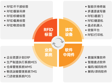 方案中包含了RFID電子標(biāo)簽、讀寫設(shè)備、手持終端、打印機(jī)、數(shù)據(jù)采集軟件、智能盤點(diǎn)軟件、業(yè)務(wù)系統(tǒng)等產(chǎn)品。